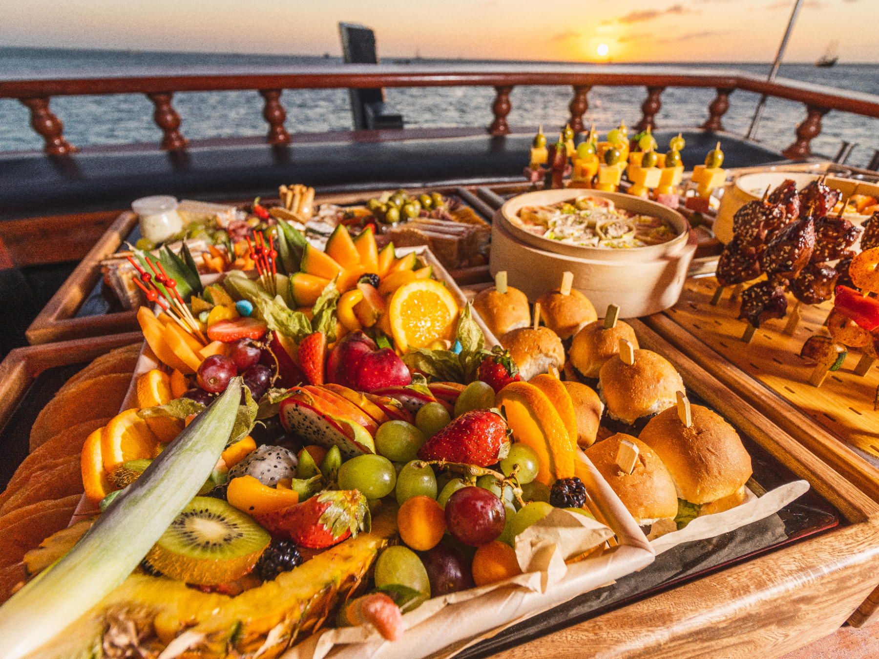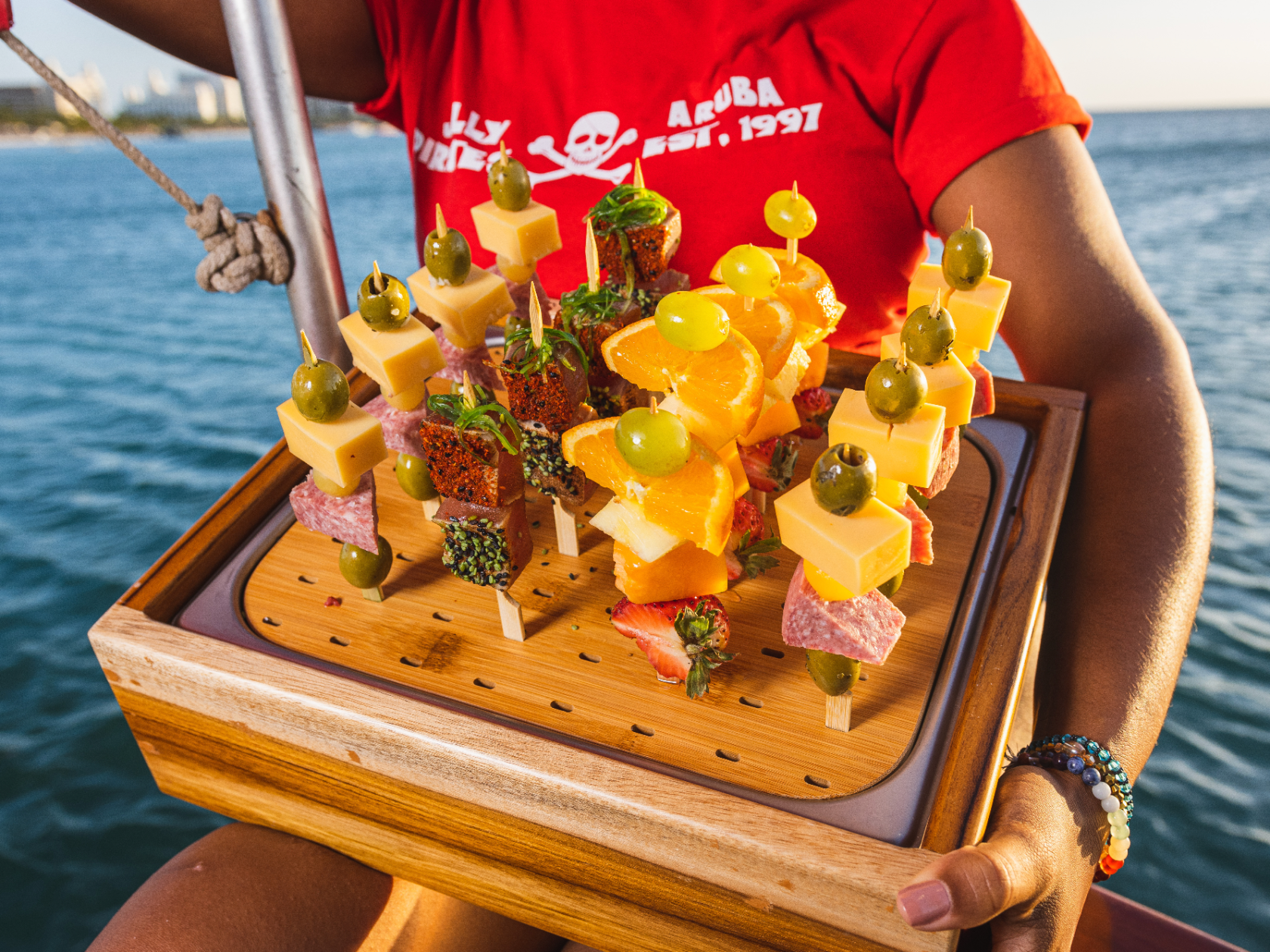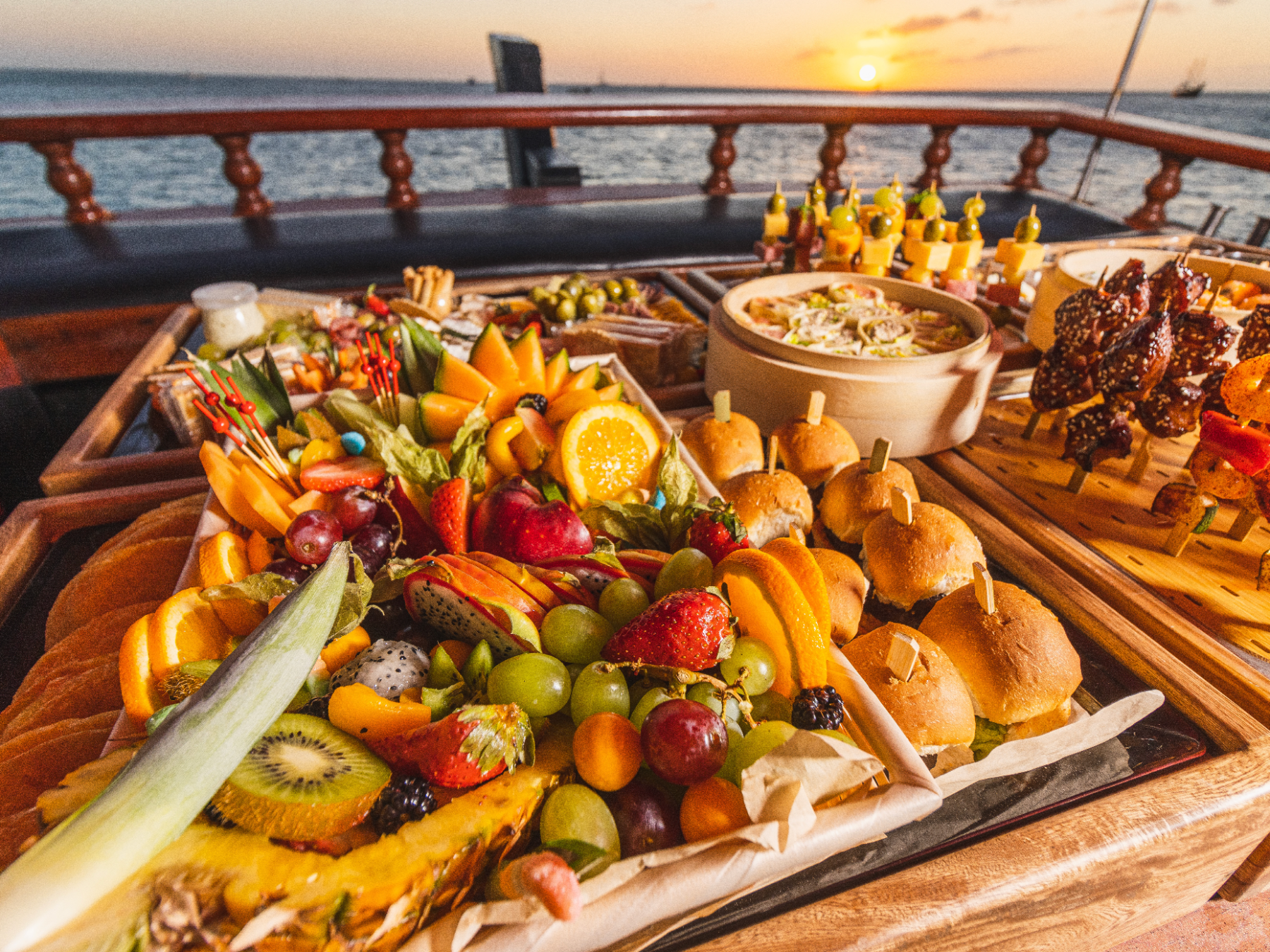 Elevate your private cruise experience with catering choices that are beautiful and tasty too. The Jolly Pirates Standard Open Bar includes locally bottled Rum, Gin, Vodka, Bourbon and Scotch. Fresh Water, Juices and Sodas are included. Pirates Poison, Captain Coladas and Rum Punch are included. White wine and Red Blends are also included in the Standard Open Bar.
